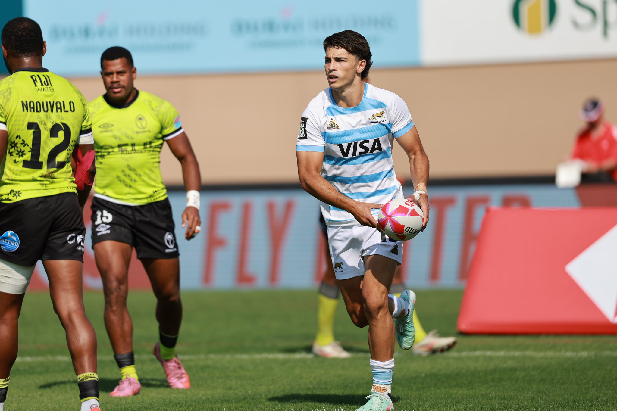 El seleccionado argentino comenzó el partido de gran manera, al adelantarse 12-0 gracias a los tries de Santino Zangara y Marcos Moneta. Luego, Fiji remontó a través de Viwa Naduvalo, en dos oportunidades, y Jeremaia Matana, para irse al descanso arriba por 19-12. Ya en el complemento, el conjunto isleño volvió a llegar al ingoal con George Bose, mientras que Los Pumas 7’s descontaron con la conquista del debutante Sebastián Dubuc. En la última jugada, y con un hombre más, el equipo de Santiago Gómez Cora tuvo la chance de igualarlo, pero Fiji recuperó y finalizó el encuentro.