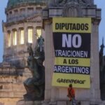 CABA: un activista se trepó a un monumento en el Congreso para protestar por la Ley de Glaciares